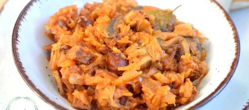 Przygotować 2 duże garnki. Do jednego wrzucić poszatkowaną, białą kapustę a do drugiego pokrojoną i odciśniętą kapustę kwaśną. Do każdego garnka wlać po około 2 szklanki wody i gotować, aż obie kapusty zmiękną, około 30 minut.